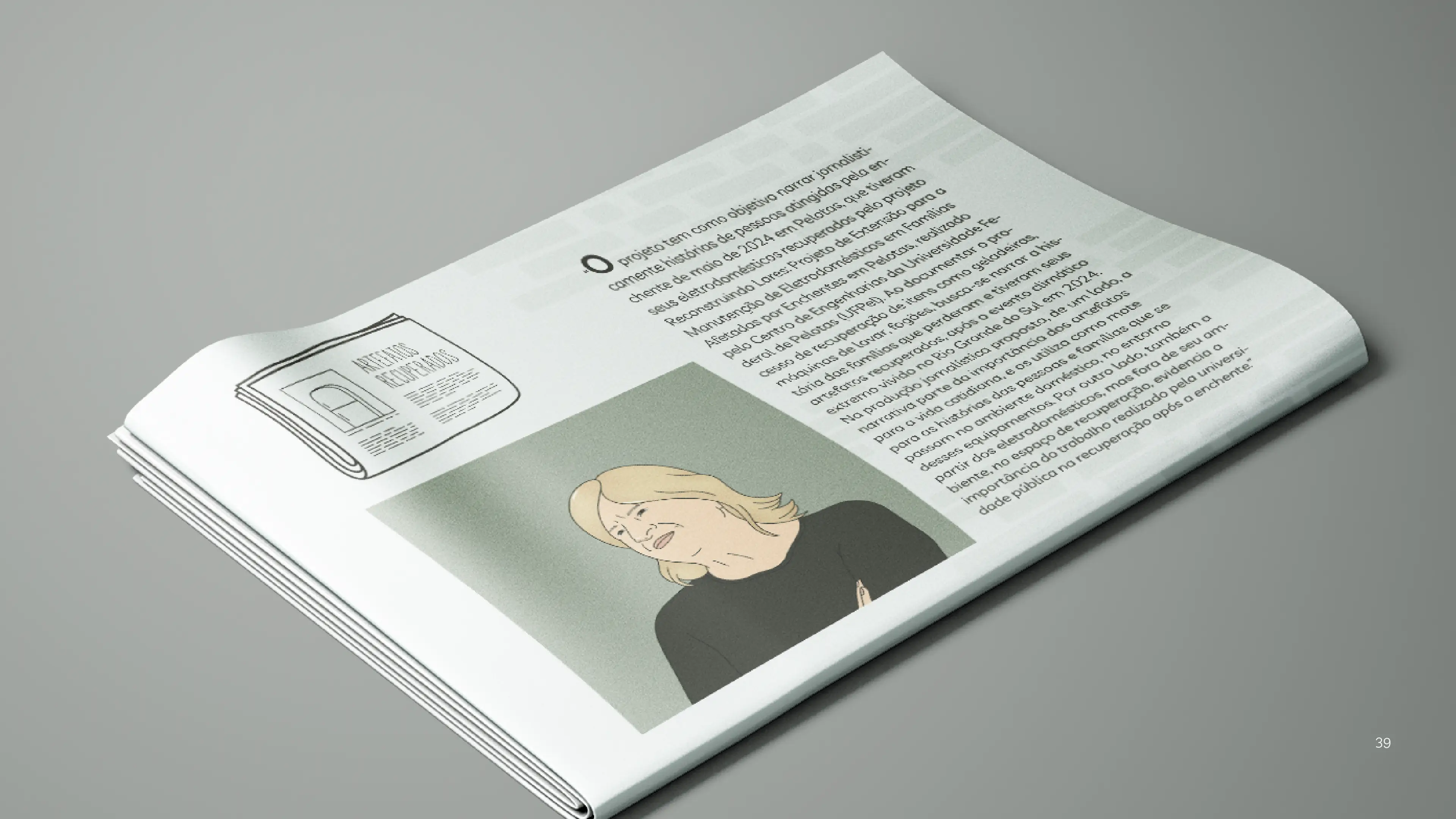 “O projeto tem como objetivo narrar jornalisticamente histórias de pessoas atingidas pela enchente de maio de 2024 em Pelotas, que tiveram seus eletrodomésticos recuperados pelo projeto Reconstruindo Lares: Projeto de Extensão para a Manutenção de Eletrodomésticos em Famílias Afetadas por Enchentes em Pelotas, realizado pelo Centro de Engenharias da Universidade Federal de Pelotas (UFPel). Ao documentar o processo de recuperação de itens como geladeiras, máquinas de lavar, fogões, busca-se narrar a história das famílias que perderam e tiveram seus artefatos recuperados, após o evento climático extremo vivido no Rio Grande do Sul em 2024. Na produção jornalística proposta, de um lado, a narrativa parte da importância dos artefatos para a vida cotidiana, e os utiliza como mote para as histórias das pessoas e famílias que se passam no ambiente doméstico, no entorno desses equipamentos. Por outro lado, também a partir dos eletrodomésticos, mas fora de seu ambiente, no espaço de recuperação, evidencia a importância do trabalho realizado pela universidade pública na recuperação após a enchente”.