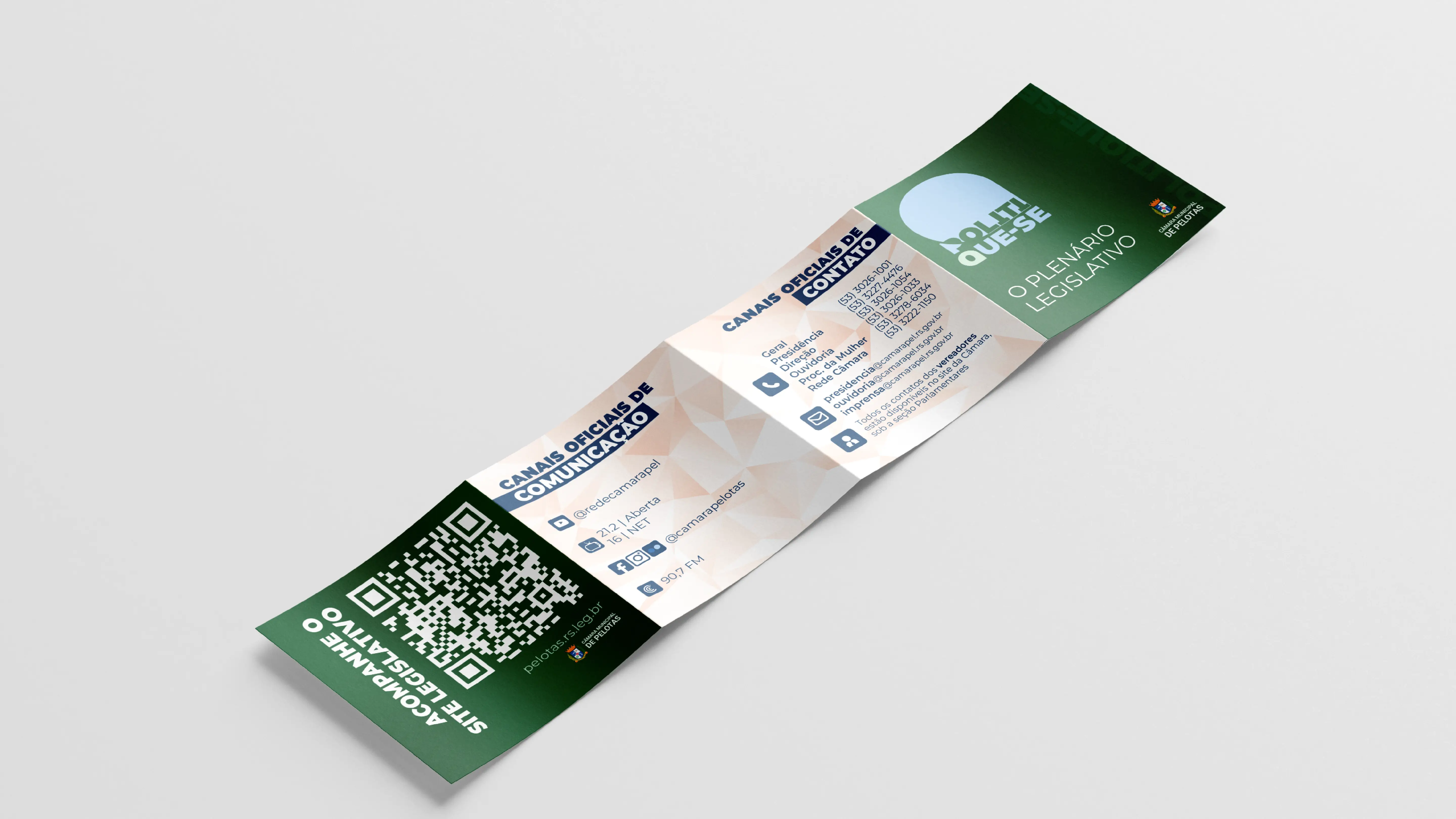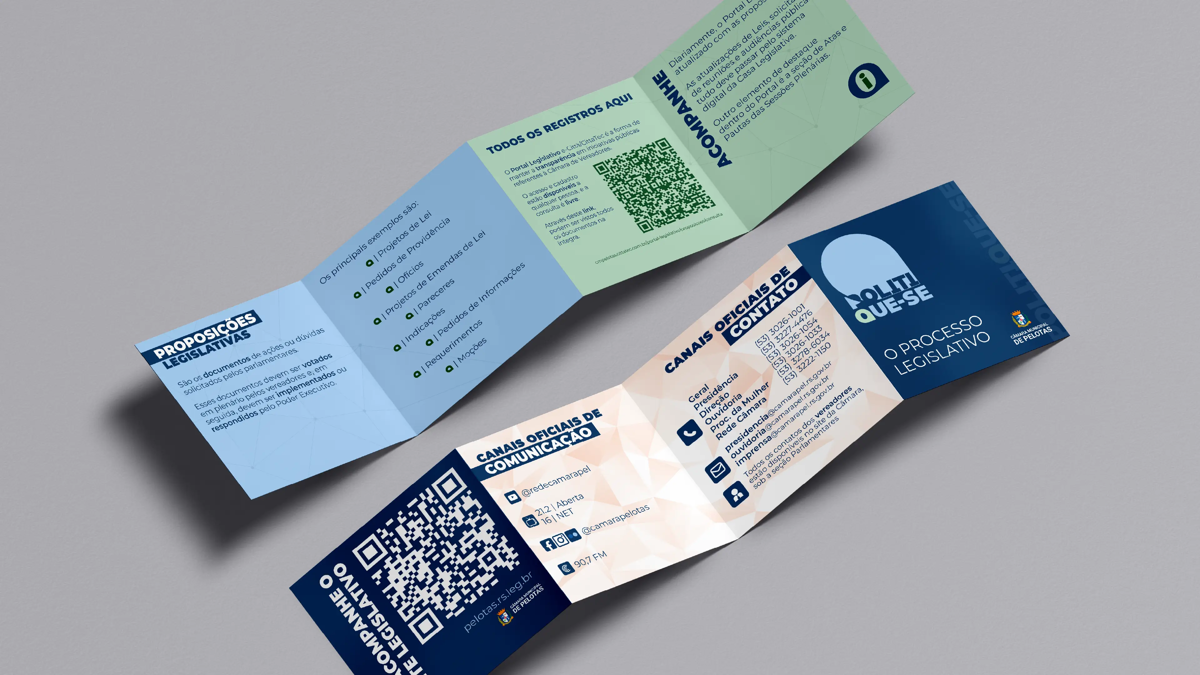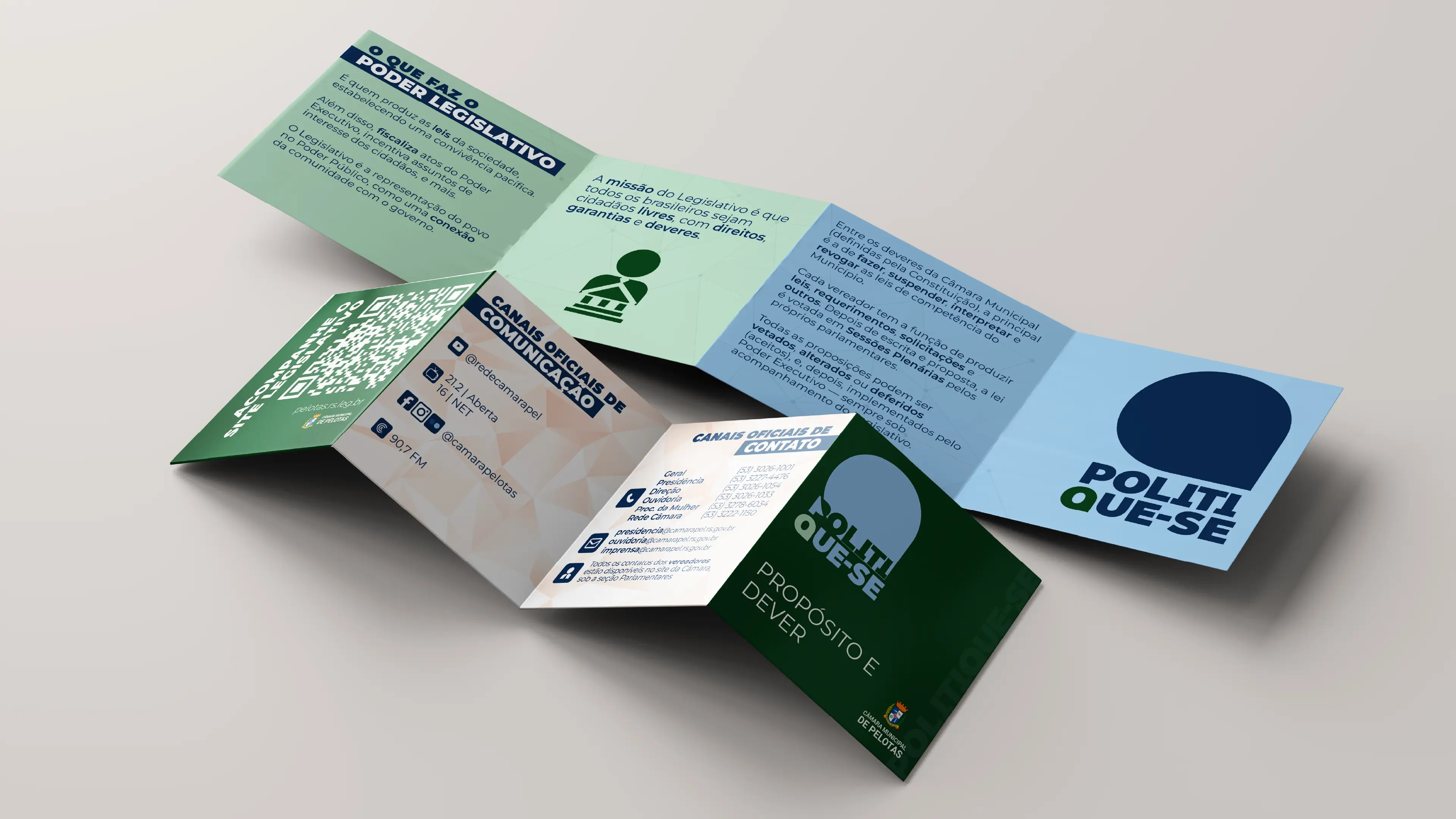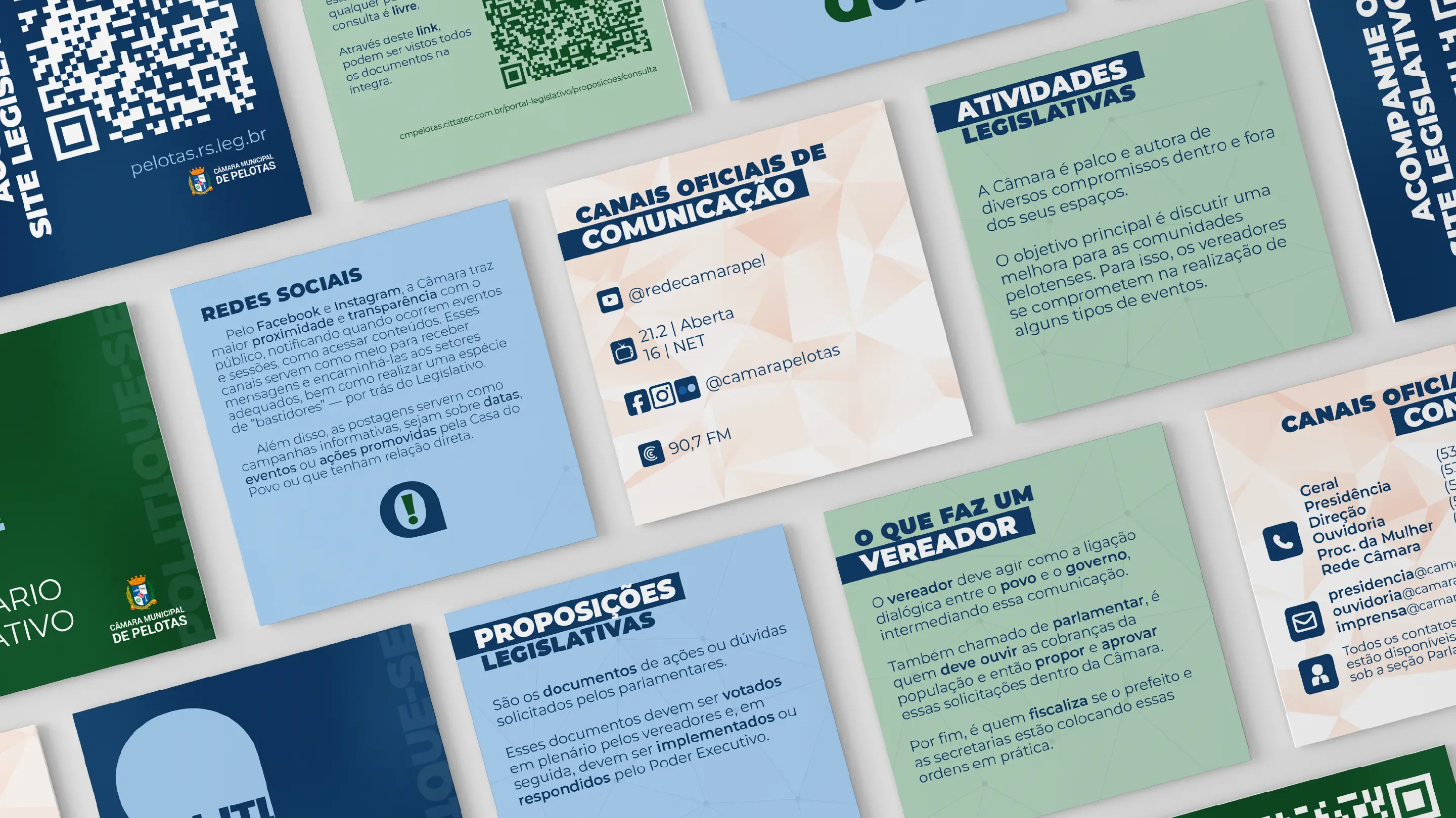 Materiais informativos criados para conscientizar a população e informar sobre como funciona, como acompanhar e o que acontece por dentro da Câmara Municipal.